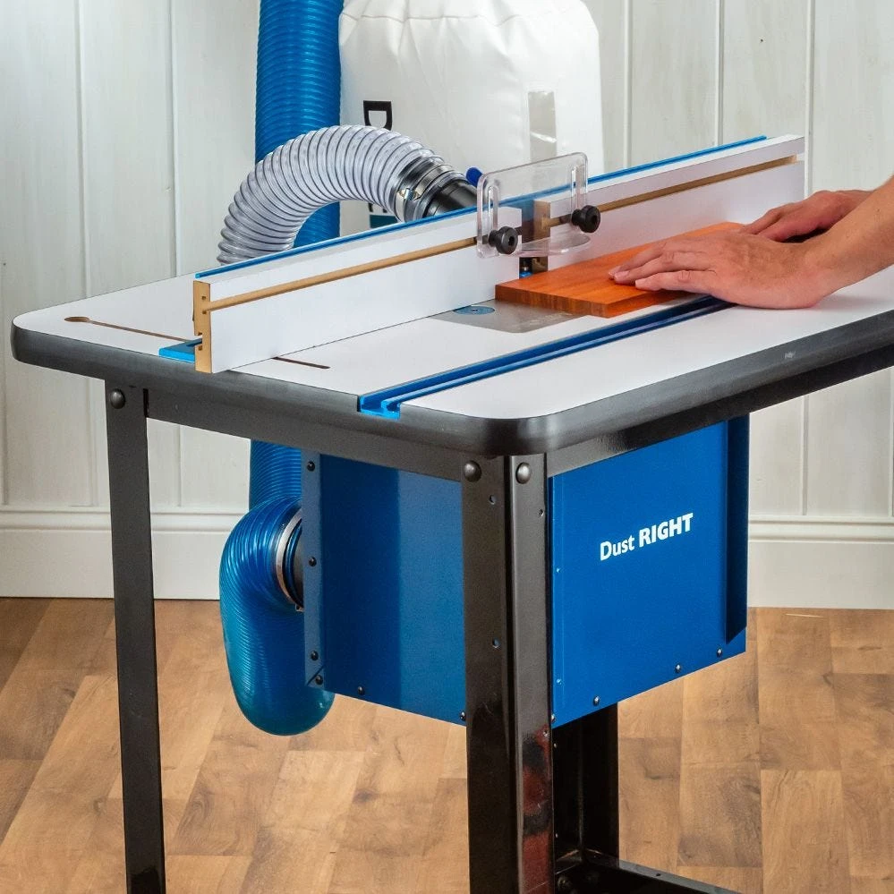 - Surrounds a table-mounted router and connects to 4” dust collection system and 2-1/2” fence port to capture nearly all routing dust and debris