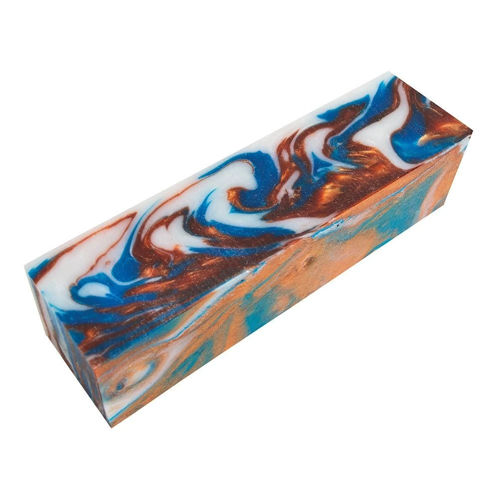 These blanks are generously cut at 1-1/2” square—perfect for turning custom handles for tools, kitchen utensils, bottle stoppers and the like. You can also subdivide them into pen blanks or knife scales. They are made from Inlace Acrylester, which is a polyester-based material that exhibits a shimmering pearlescent quality. This pattern is called Copper Canyon, a swirling blend of blue, white and metallic bronze. Inlace Acrylester is made with an optical-grade resin, which makes it visually superior to acrylic. It is slightly more challenging to turn, but the results are well worth it. It can be polished to a gleaming finish.