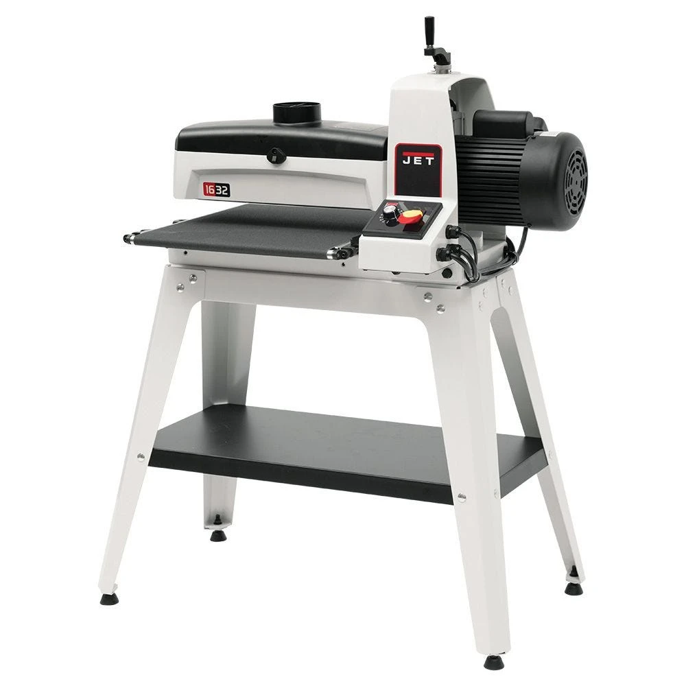 Sand panels up to 32” wide in just two easy passes with the Jet 16-32 Drum Sander. One pass will sand a panel up to 16” wide. Simple tool-free knobs let you adjust the drum parallel to the table to eliminate crowning and unsightly lines in the middle of panels over 16” wide. Variable-speed dial lets you choose the optimal feed rate for a wide range of projects and wood species. Sandsmart technology continuously monitors the load on the drum motor and adjusts the feed rate to prevent overload. The mirrored design of the dust hood optimizes dust flow. Try the Jet Drum Sander today to achieve effortless, professional-quality surfaces.