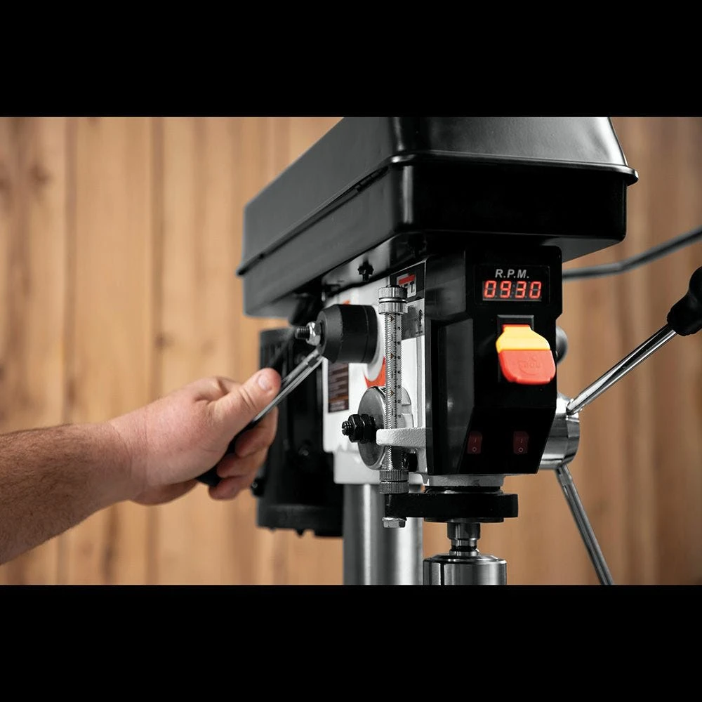 Power and portability need not be mutually exclusive, and the Jet 12” Variable Speed Drill Press is evidence of that. Its 1/2 HP induction motor pushes through almost anything you can throw at it, and with over 3-1/8” of spindle travel, you get big press drilling depth in a package that fits on any benchtop or work table. Plus, the variable speed is easily adjusted with just one jumbo lever, and the speed is displayed on the integral digital read-out. Add to that the innovative X-shaped XACTA Laser cross hairs and the flexible LED work light, and you get accuracy and convenience that you’ll appreciate every time you use it.