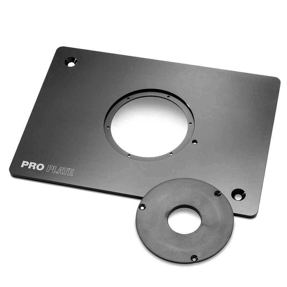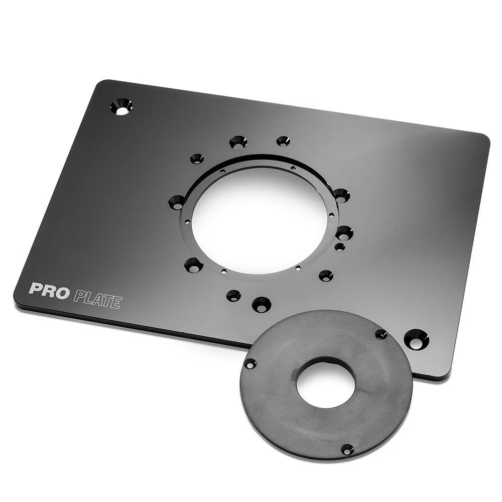 A router table insert plate makes it easy to lift your router out and set it on the table for comfortable bit changes, height adjustments, maintenance and even to use your router free hand or with a straight edge guide. These router table baseplates save you from a lot of backaches, squinting and bumps on the back of the head from stooping under the table. Our Aluminum Pro Plates are CNC-machined for flatness, will not sag, and are generously dimensioned at 8-1/4” x 11-3/4”. They work equally as well with shop-made router tables as they do with Rockler tables, and fit both our current tables and most of our old tables as well. Additional insert ring sizes are available (sold separately). Plates A & B accept Standard sized rings. Plates C & D accept Large sized rings.