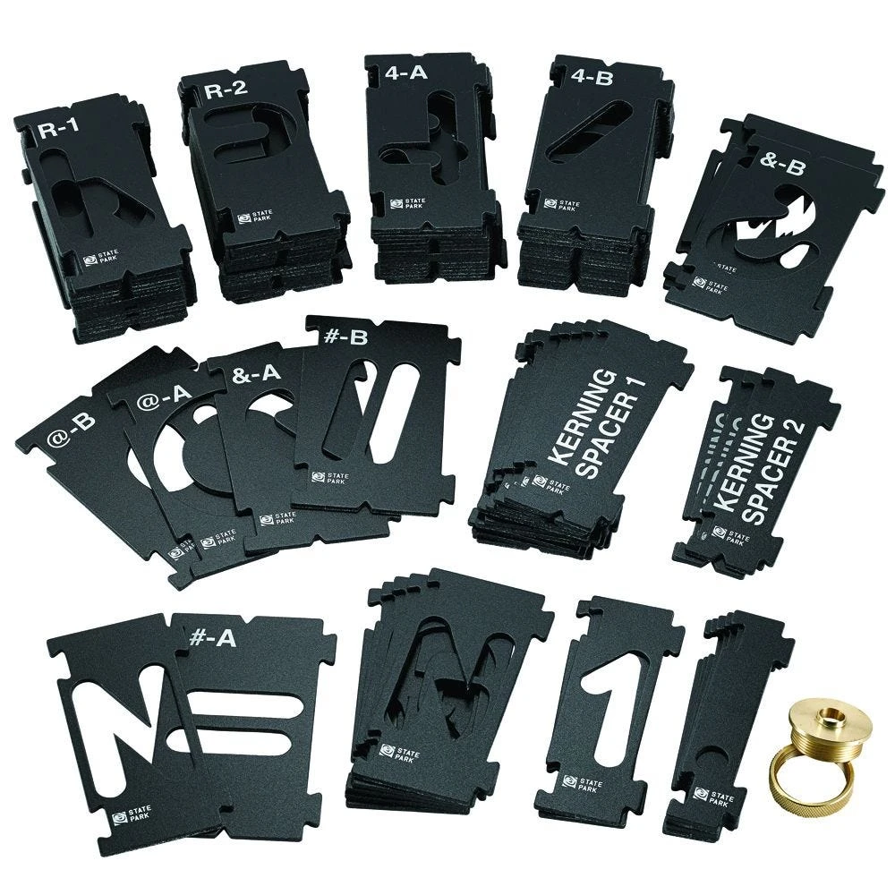 Produce countless enduring, classic signs with our instantly recognizable ”State Park” Font sign-making system. Our State Park letter templates feature adjustable kerning for the most natural-looking layout of your text, with neat, even spacing between all letters. The kit includes a total of 99 template pieces, with letters, numbers, symbols, and kerning spacers. Includes a high-quality brass guide bushing. Recommended for use with a plunge router.
