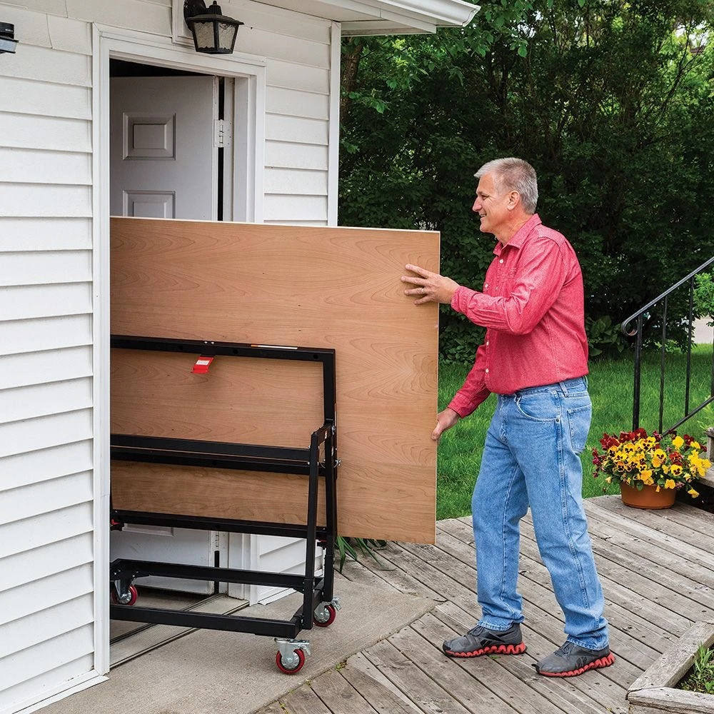 The Rockler Material Mate Panel Cart/Shop Stand lets you easily roll 4′ x 8′ sheets from your truck or lumber rack to your table saw. The tilting top allows convenient loading if you store your sheet stock on edge, a common space-saving practice in small shops. With the Material Mate tilted, the sheet can be transferred from the rack with minimal repositioning. The vertical position also allows passage through a service door as narrow as 30”, and provides a more compact footprint when not in use. With the top in the horizontal position, you can unload sheets directly off the bed of your truck. When not in use as a panel cart, you can add a top and use the Material Mate as a mobile shop stand, work table or outfeed table.