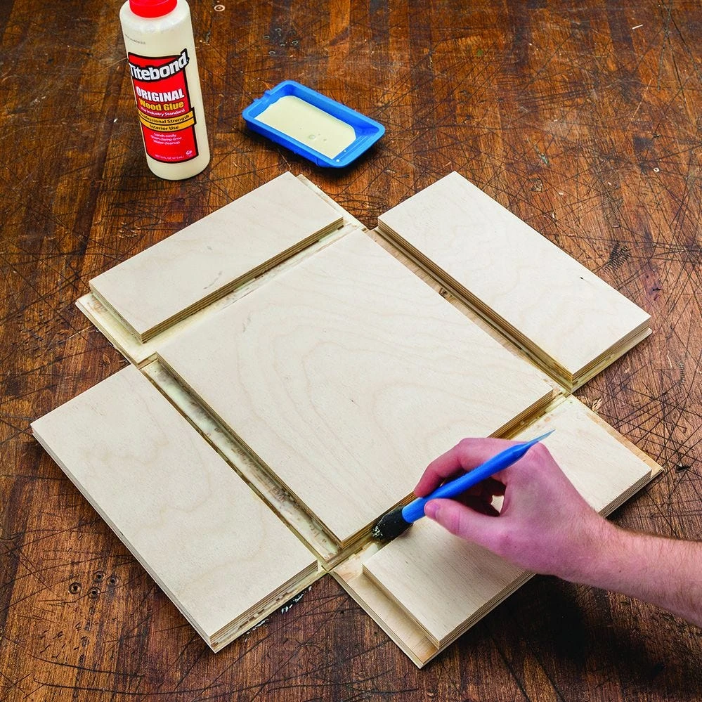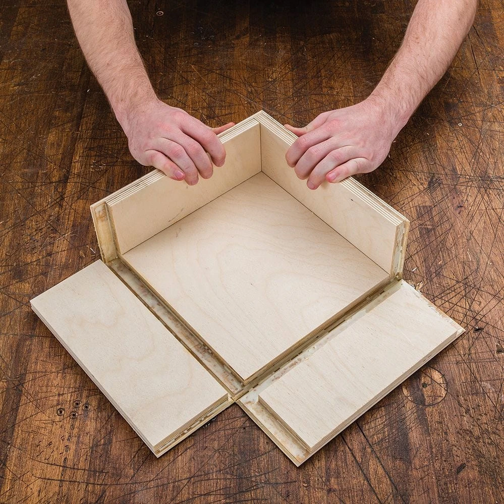 With just four passes on the table saw, the Rockler Miter Fold Dado Set turns a flat sheet of plywood or hardwood into a box with four sides and a top or bottom. The blade cuts a profiled channel through most of the wood, leaving just the face veneer intact. The joint is then folded, hinging on the veneer, which leaves a seamless corner, and grain that flows beautifully through the joint. The miter fold blade can be used to create casework, boxes and drawers with minimal tools and setup, and can also be used as an ordinary 8” dado set. When compared to a simple v-groove miter fold, the Rockler Miter Fold makes a joint that is stronger, easier to clamp and less prone to glue squeeze-out. The unique locking profile keeps the miters from sliding around under clamping pressure, and creates a longer joint line for greater strength. A common problem with basic 45° miter folds is that glue is funneled to the inside of the joint when the joint is folded closed. The Rockler Miter Fold dado cutter uses a rabbet profile at the inside of the joint to reduce this tendency. The result is a strong, clean joint with almost no sanding required.