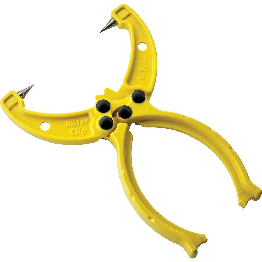 Clamping miters couldn’t get much easier than with the Miter Clip. Just position the Miter Clip and squeeze-the reverse cam mechanism applies pressure and holds the miter clamp firmly shut, while the notch keeps the tips of the miters neatly aligned. Once clamped, you can also rotate the clamp handle up and out of the way, providing access so you can nail the miter and move on to the next corner. The metal spurs hold the wood firmly and allow the clamp to be rotated, while leaving minimal marks. Made in the USA.
