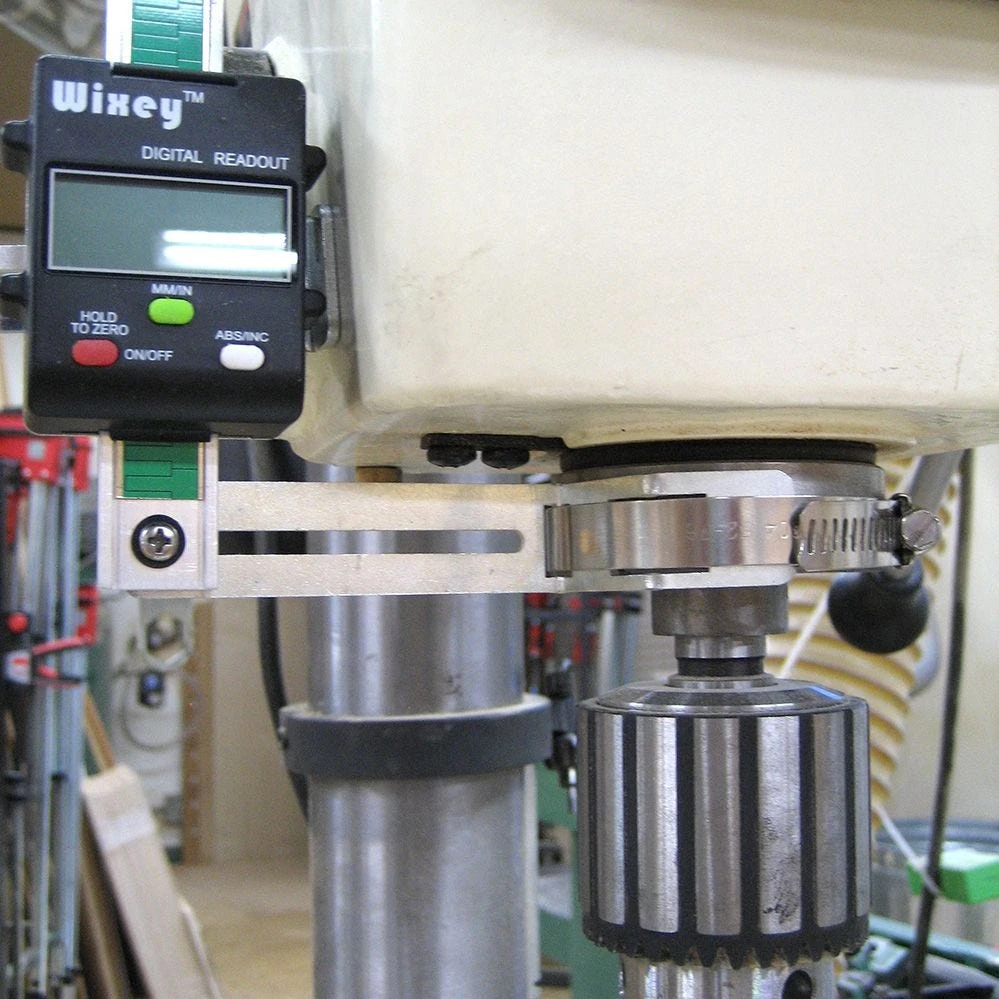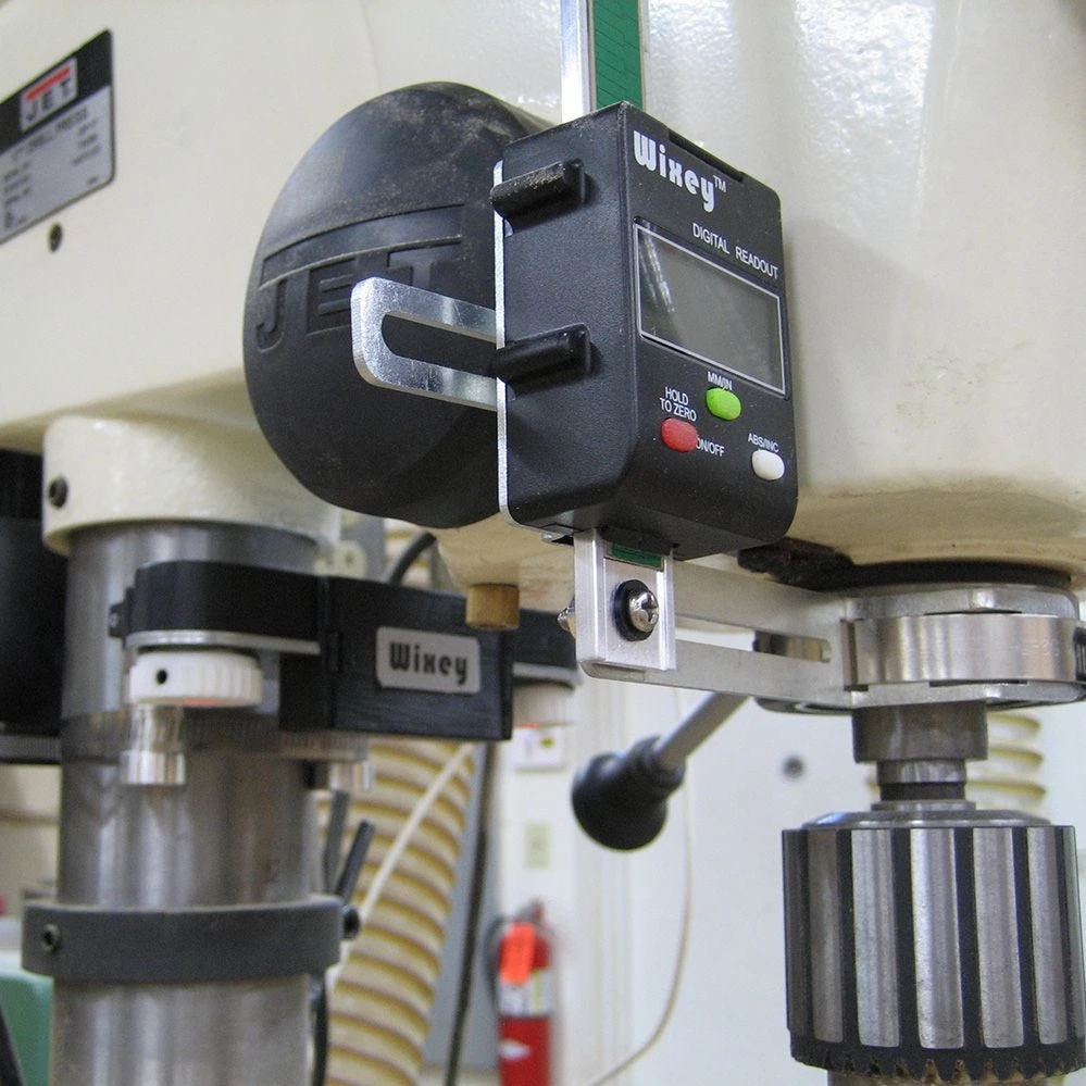 The Wixey WR503 Digital Drill Press Depth Gauge makes it easy to view the exact depth of your drill bit. Simply lower the bit to the surface of your workpiece and zero out the display, then drill to the desired depth! If you wish to set the depth stop for repeated drilling, simply lower the bit until the readout shows the target depth, then lock the depth stop at that point. It’s ideal for drilling the 35mm holes for euro style cabinet hinges, where accurate hole depth is important. The gauge mounts to almost any drill press, either to the existing depth stop rod or directly to the quill collar.